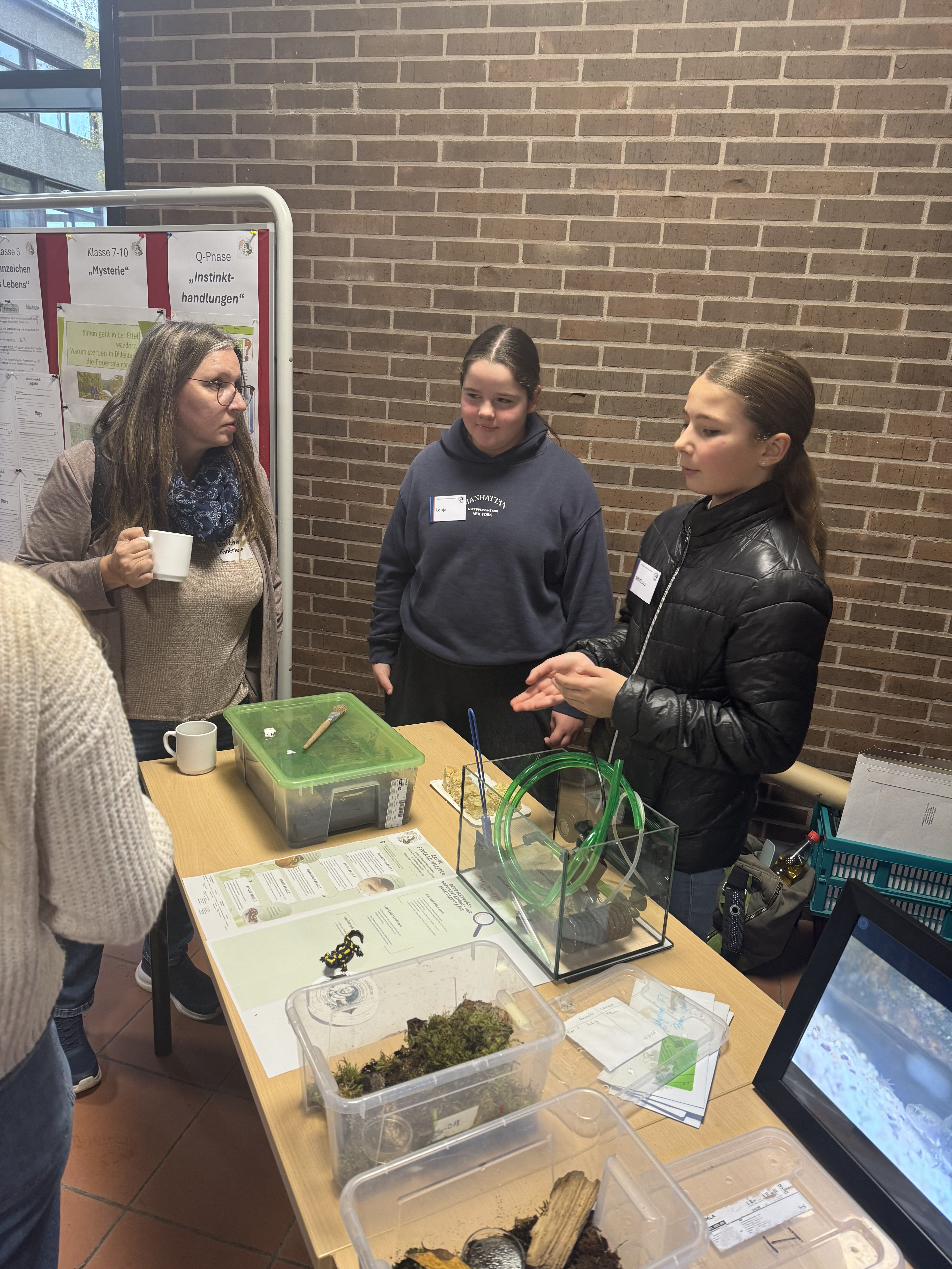 Gleich zu Beginn des Tages wurde das Team vom Hessischen Rundfunk interviewt (der Beitrag wird in den kommenden Tagen im HR-Radio zu hören sein). Später standen Sedric Haus und Marlene Hübscher (7c) auf der Bühne: Im Gespräch mit Moderatorin Anna Wöbse berichteten sie von der erfolgreichen Salamanderhaltung an der WvO und vom großen pädagogischen Mehrwert für die gesamte Schulgemeinde.
