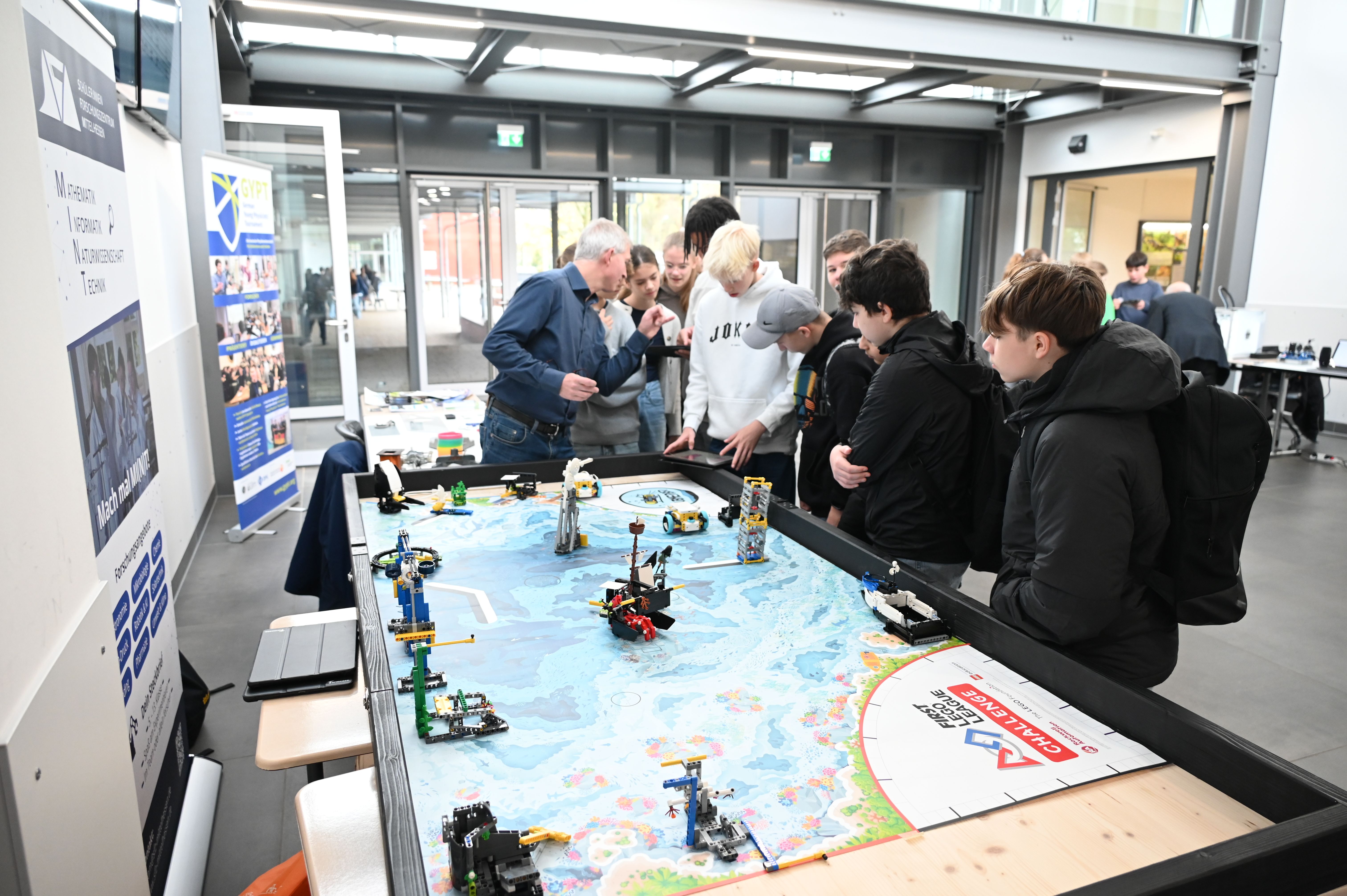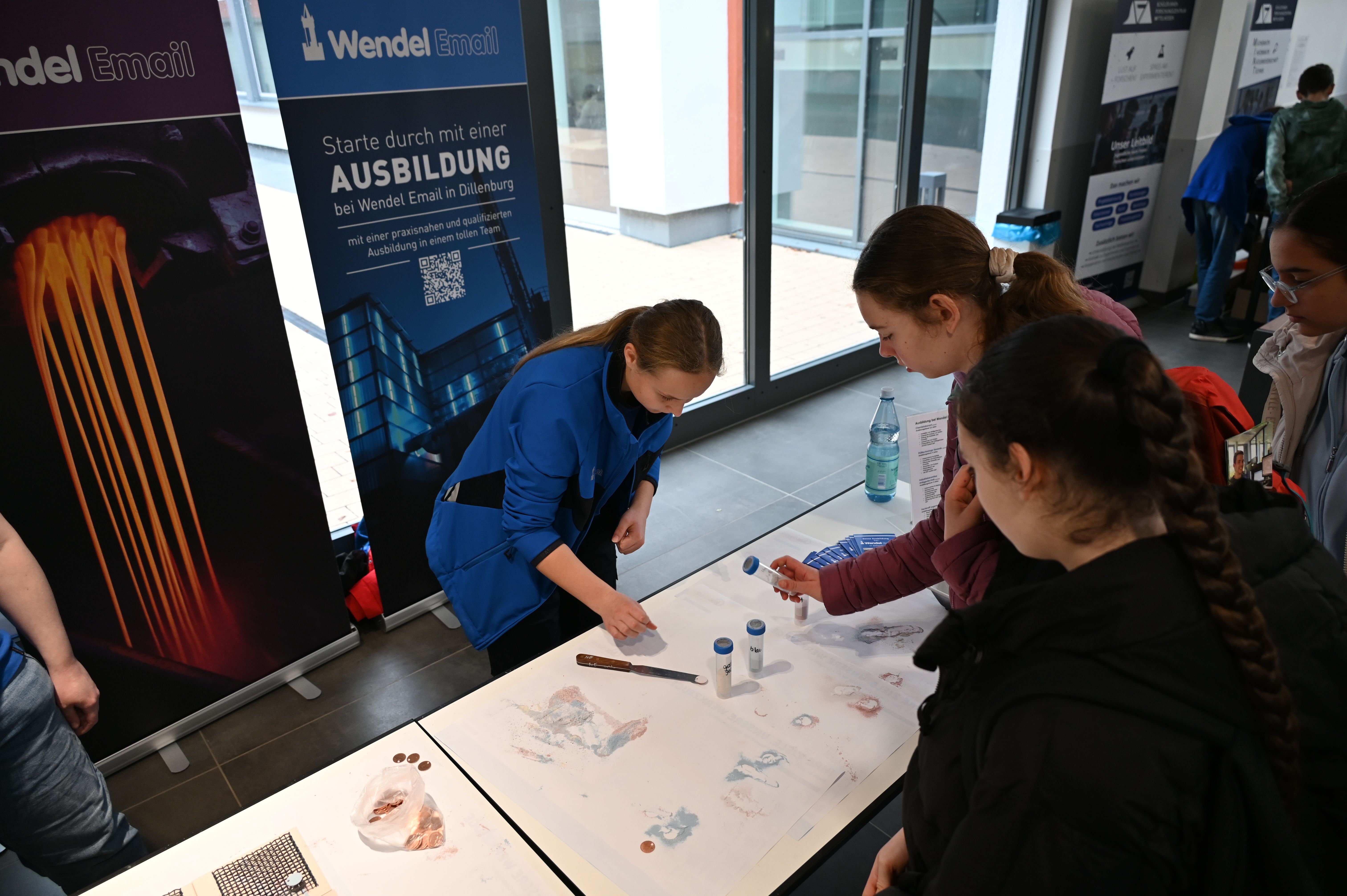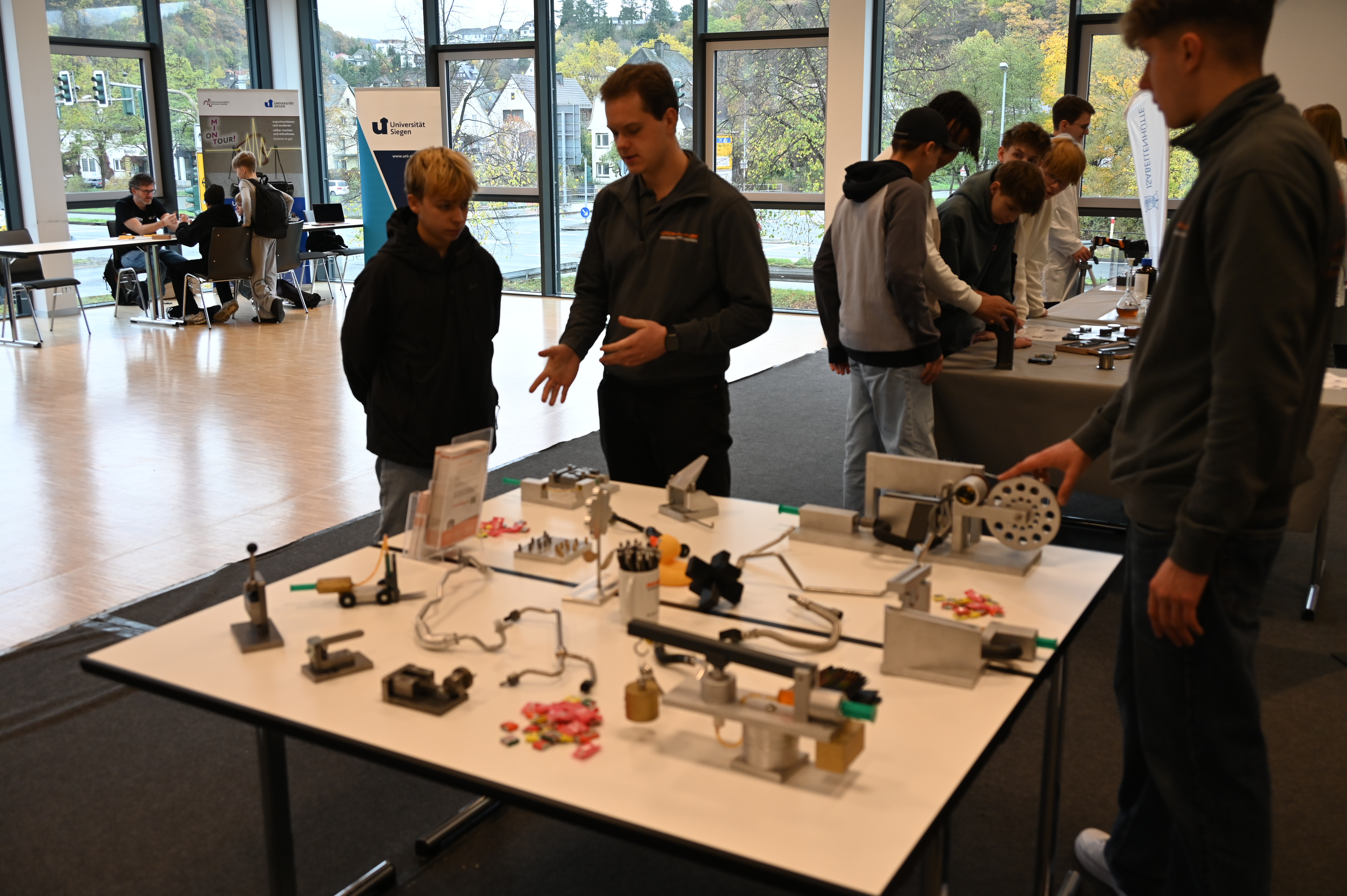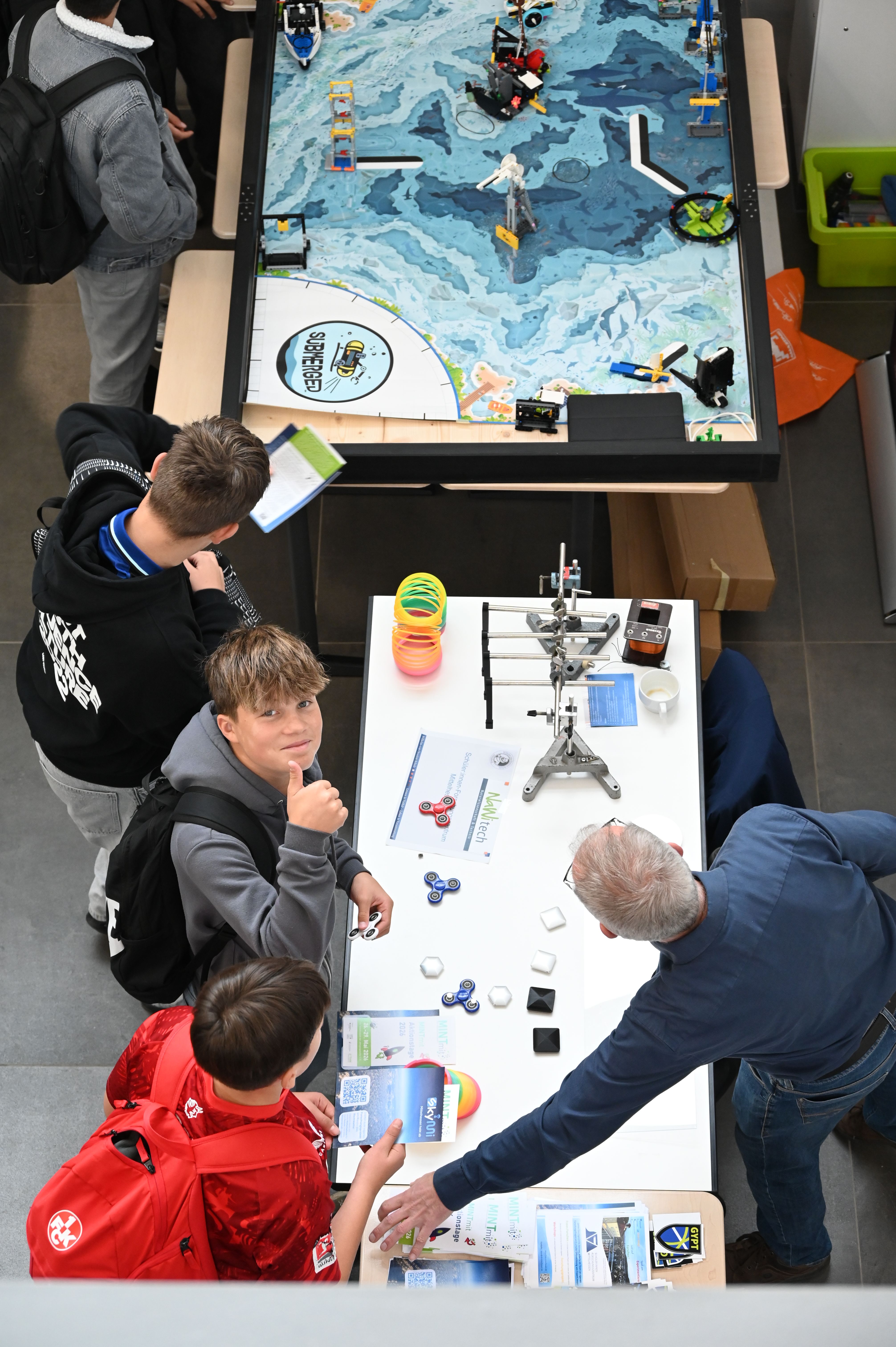 Die zahlreichen Mitmachangebote luden zum Ausprobieren ein. Im Atrium konnte man am Stand des Mathematik-Zentrums Wetzlar an mathematischen Rätseln knobeln, mit den Robotern des Gymnasiums Johanneum Herborn sprechen, an der Universität Siegen einen eigenen Elektromotor bauen, seine Geschicklichkeit bei Cohline am „Heißen Draht“ prüfen und am Stand der Isabellenhütte sein Wissen über Metalle unter Beweis stellen. Auch in der Eingangshalle gab es viel zu entdecken. Am Stand des Schülerforschungszentrums Mittelhessen wurden Lego-Roboter programmiert, der Verein Deutscher Ingenieure (VDI) informierte über 3D-Druck, bei Wendel-Email durfte emailliert und am schuleigenen Stand mikroskopiert werden. Elektrotechnik zum Anfassen boten zudem die EAM, Loh-Services und Carl Cloos Schweißtechnik. Ein besonderer Anziehungspunkt war der große Stand der Technischen Hochschule Mittelhessen, an dem die Schülerinnen und Schüler ihren eigenen Game-Controller bauen und programmieren konnten.