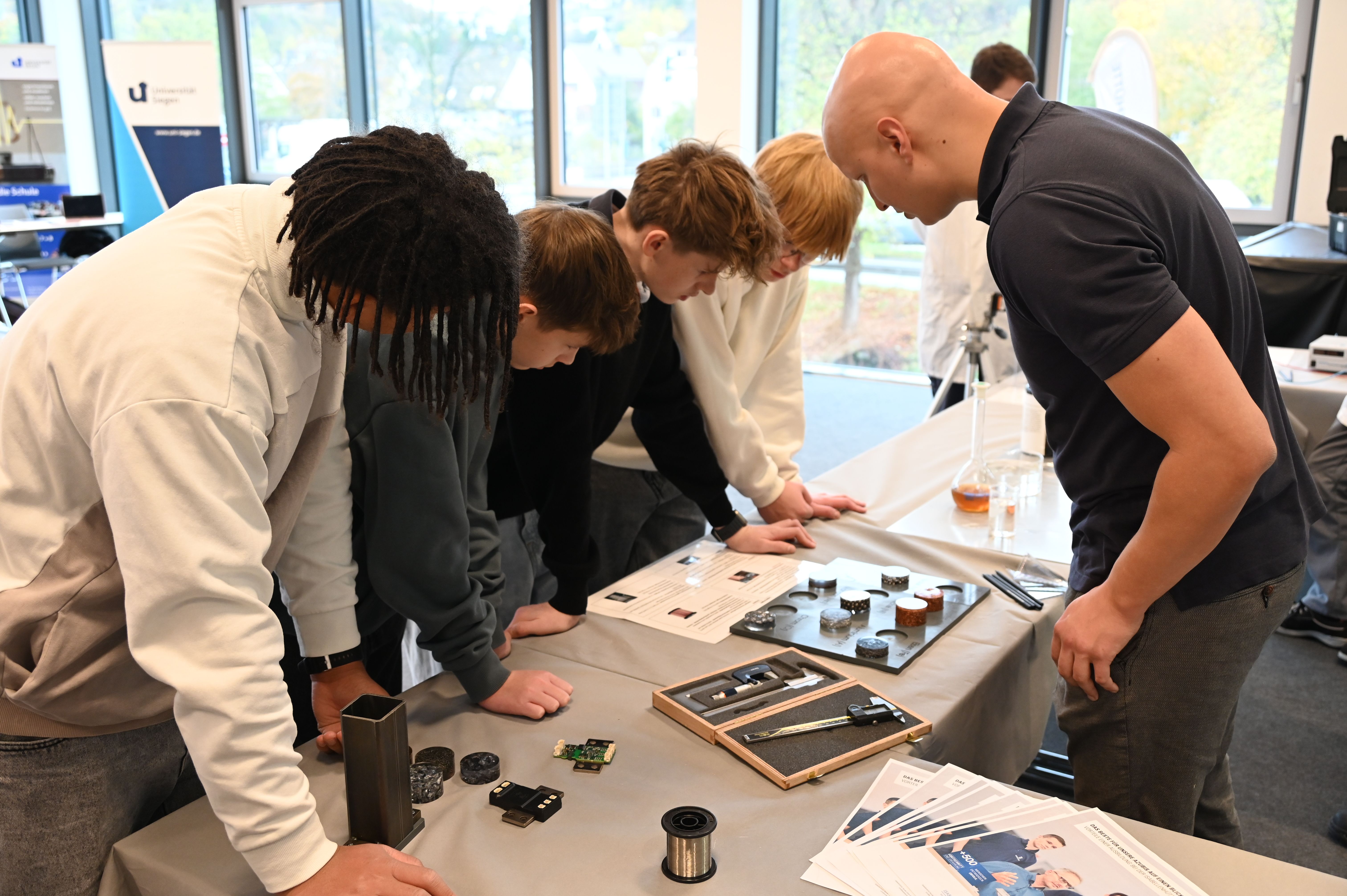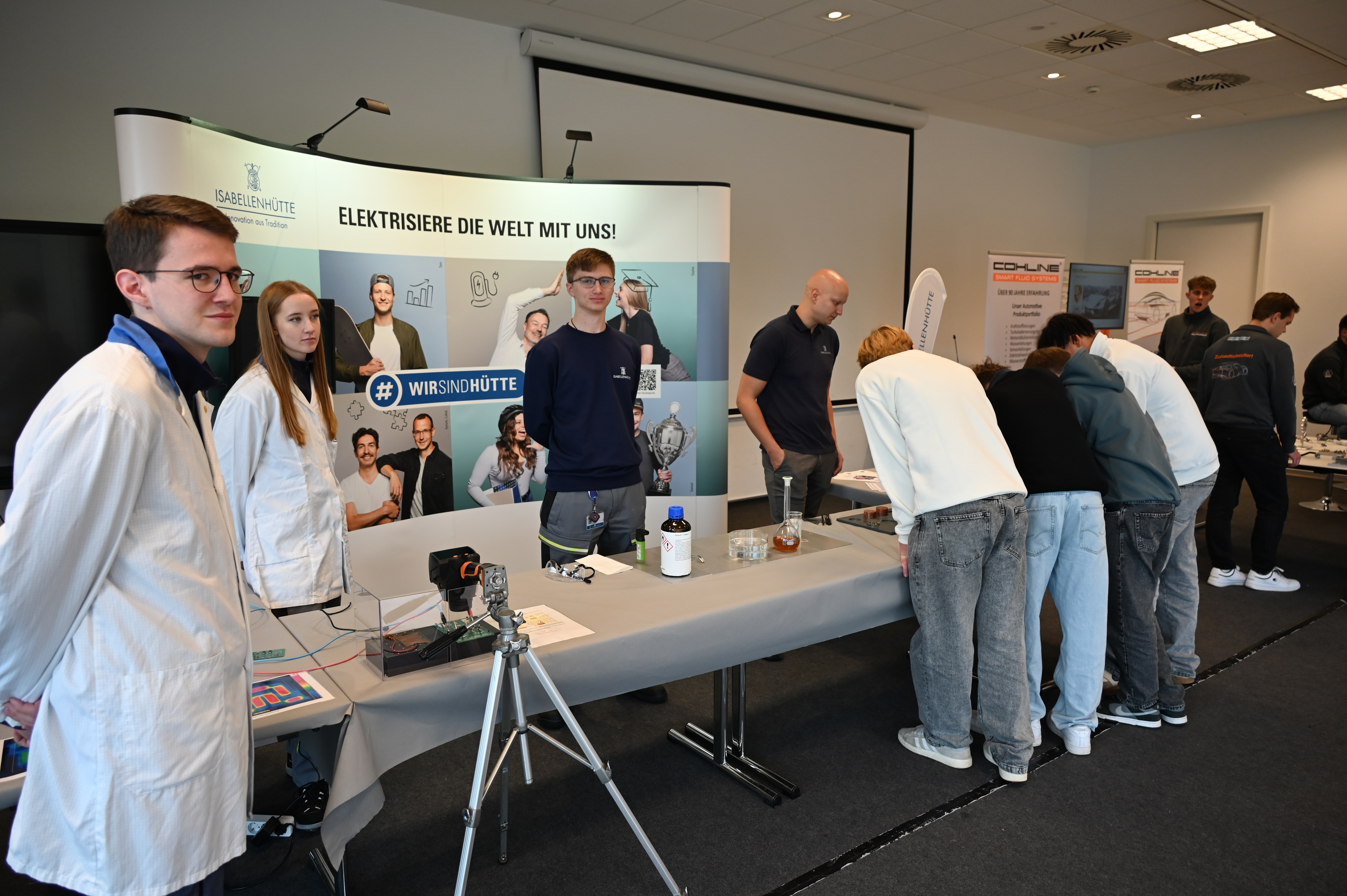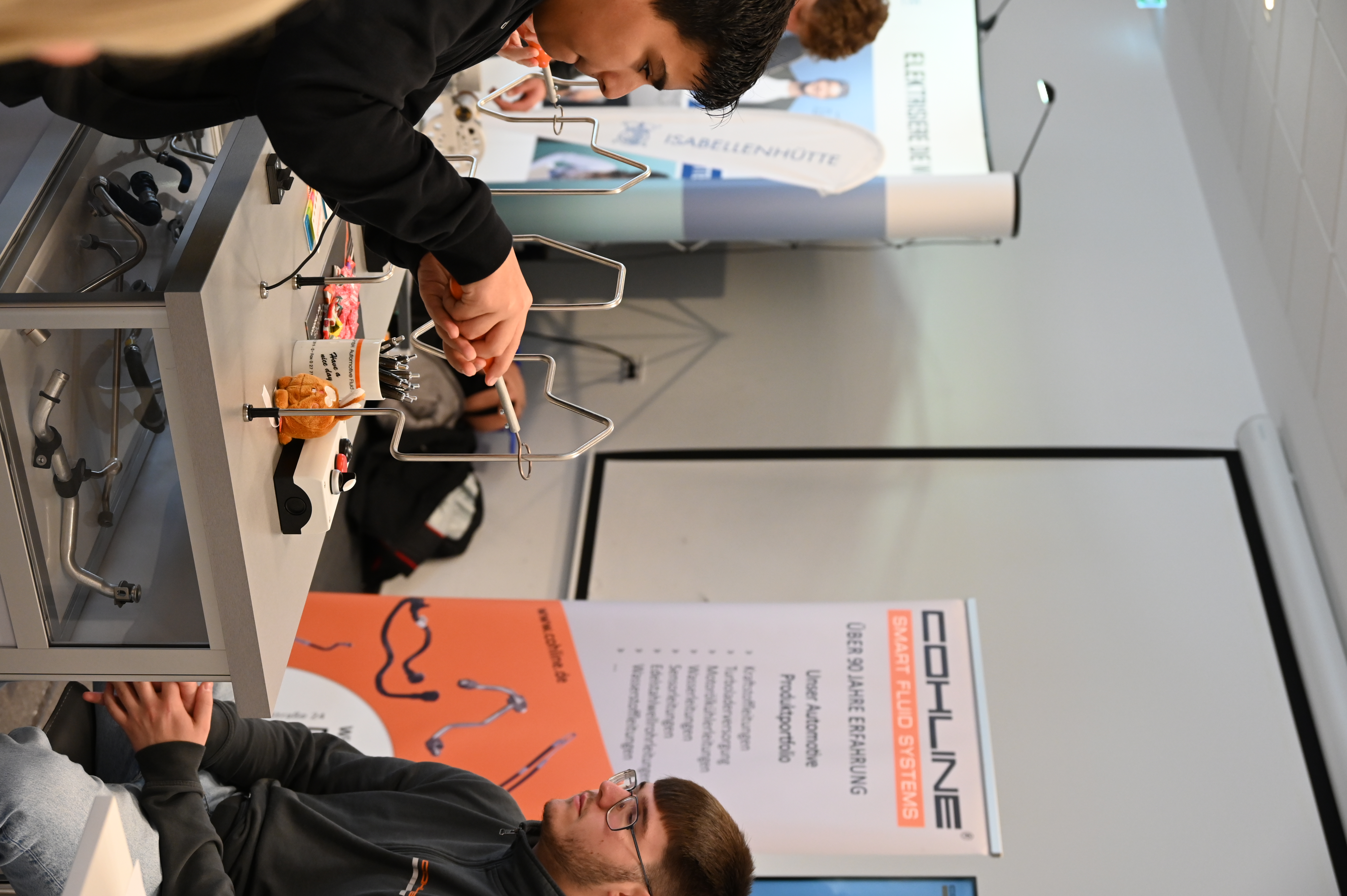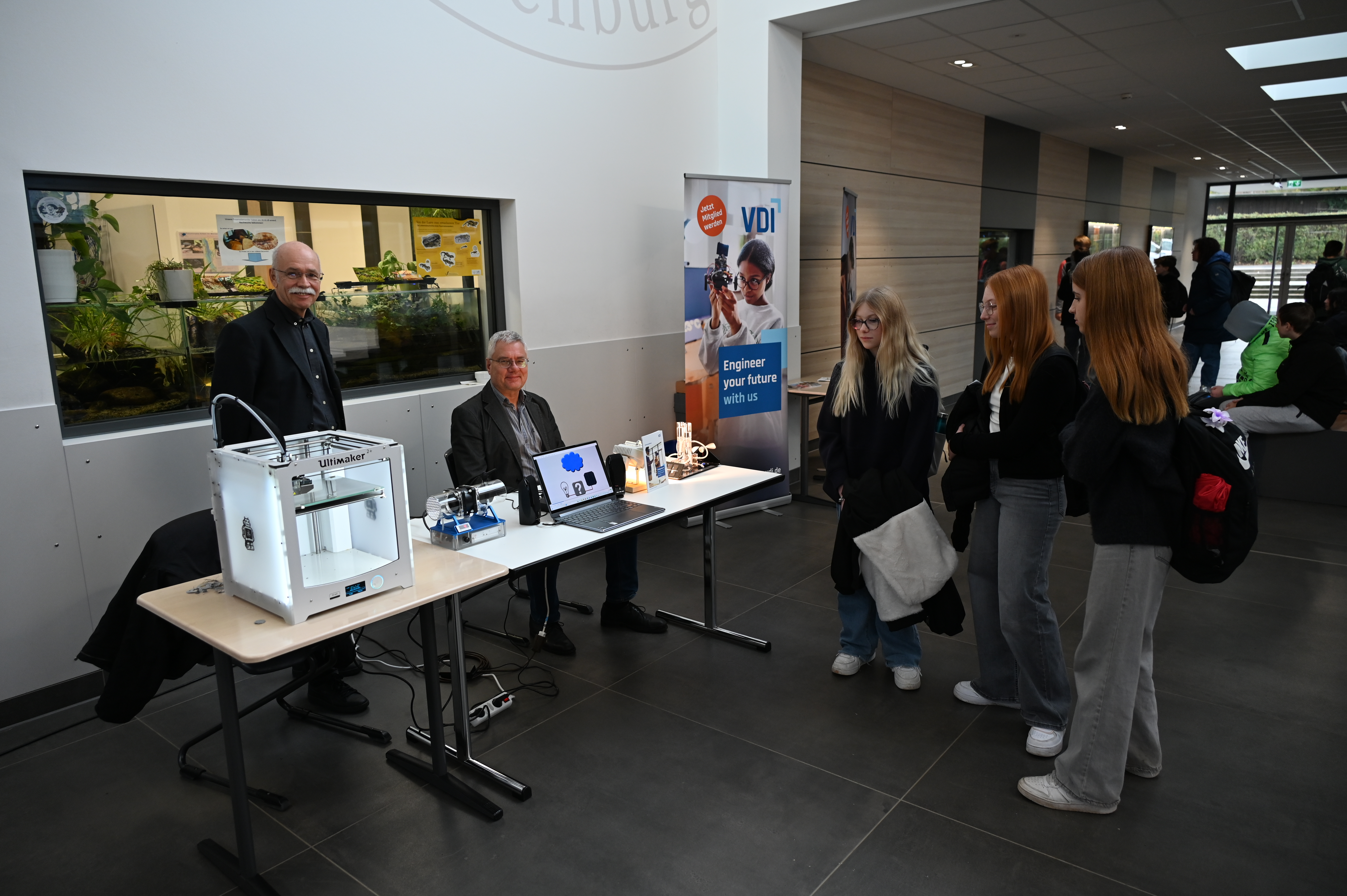 Die zahlreichen Mitmachangebote luden zum Ausprobieren ein. Im Atrium konnte man am Stand des Mathematik-Zentrums Wetzlar an mathematischen Rätseln knobeln, mit den Robotern des Gymnasiums Johanneum Herborn sprechen, an der Universität Siegen einen eigenen Elektromotor bauen, seine Geschicklichkeit bei Cohline am „Heißen Draht“ prüfen und am Stand der Isabellenhütte sein Wissen über Metalle unter Beweis stellen. Auch in der Eingangshalle gab es viel zu entdecken. Am Stand des Schülerforschungszentrums Mittelhessen wurden Lego-Roboter programmiert, der Verein Deutscher Ingenieure (VDI) informierte über 3D-Druck, bei Wendel-Email durfte emailliert und am schuleigenen Stand mikroskopiert werden. Elektrotechnik zum Anfassen boten zudem die EAM, Loh-Services und Carl Cloos Schweißtechnik. Ein besonderer Anziehungspunkt war der große Stand der Technischen Hochschule Mittelhessen, an dem die Schülerinnen und Schüler ihren eigenen Game-Controller bauen und programmieren konnten.