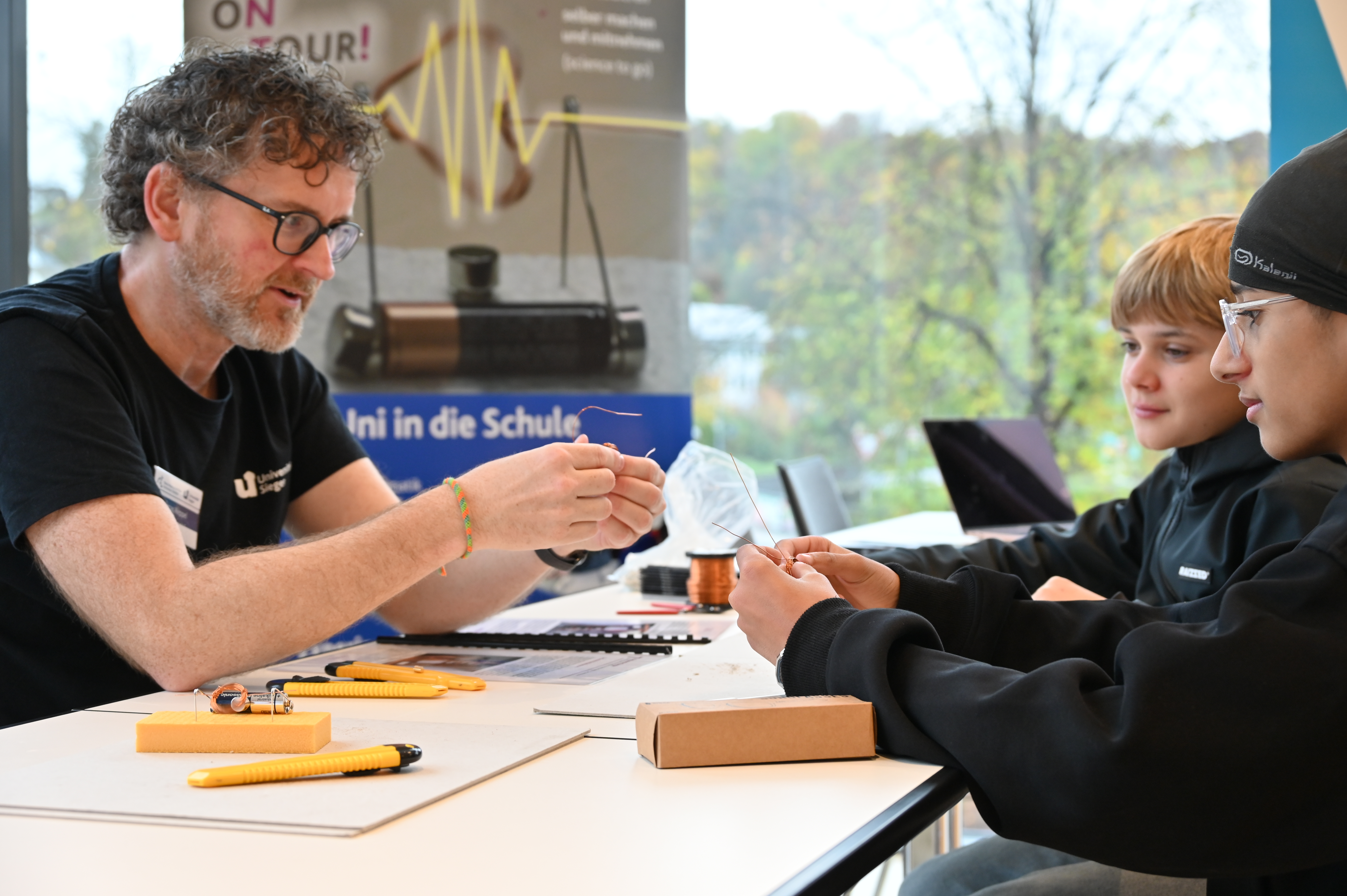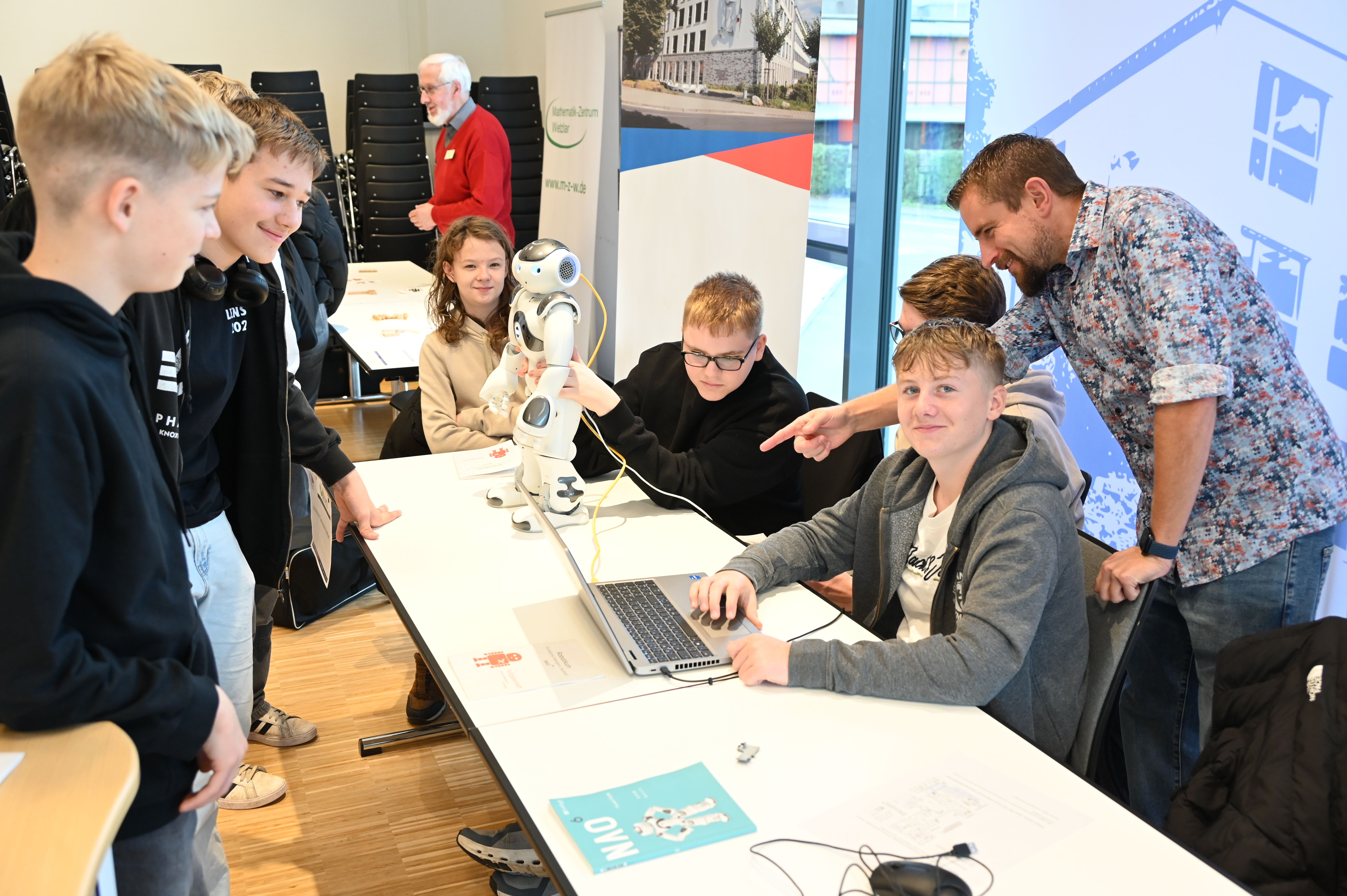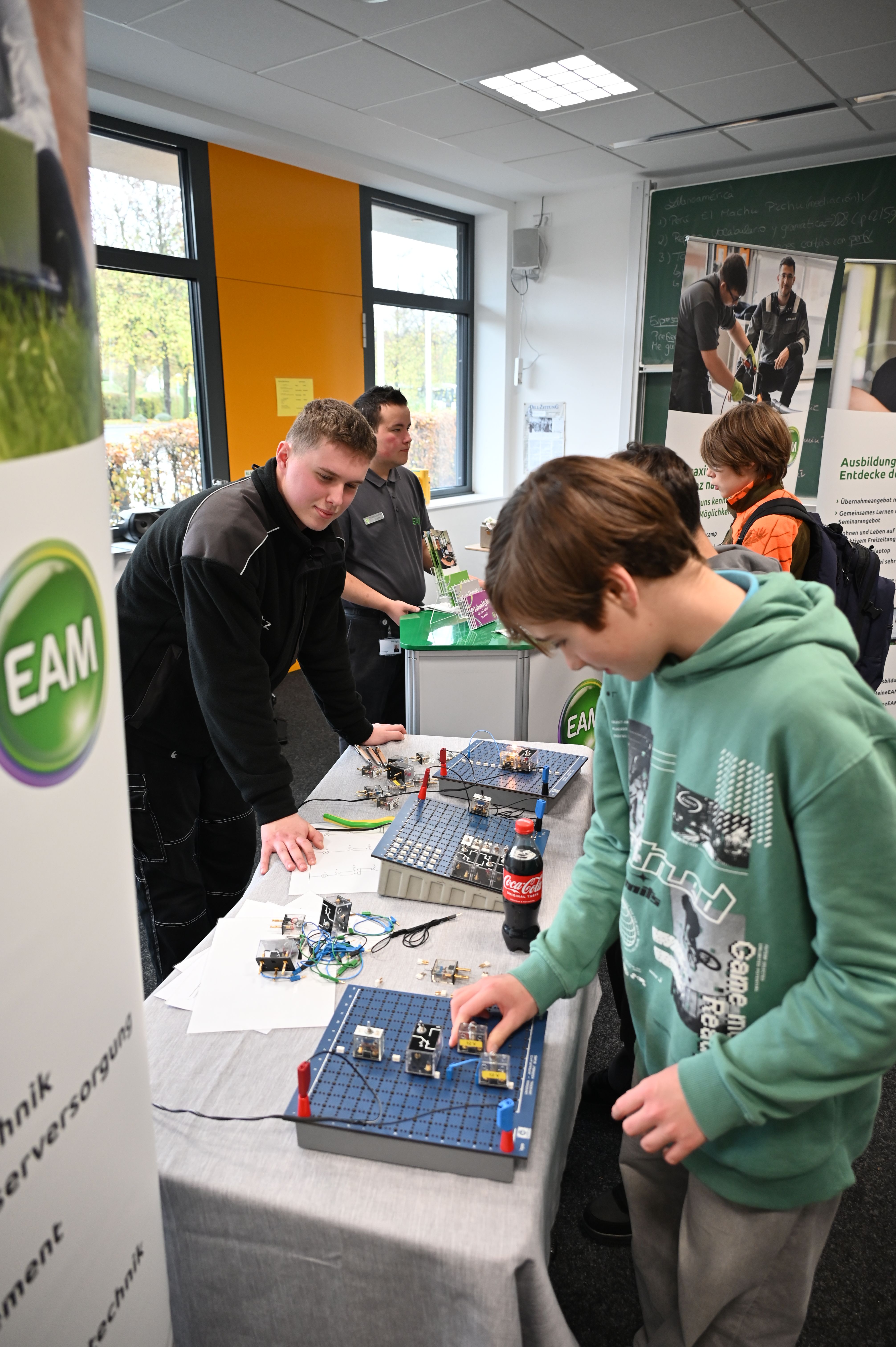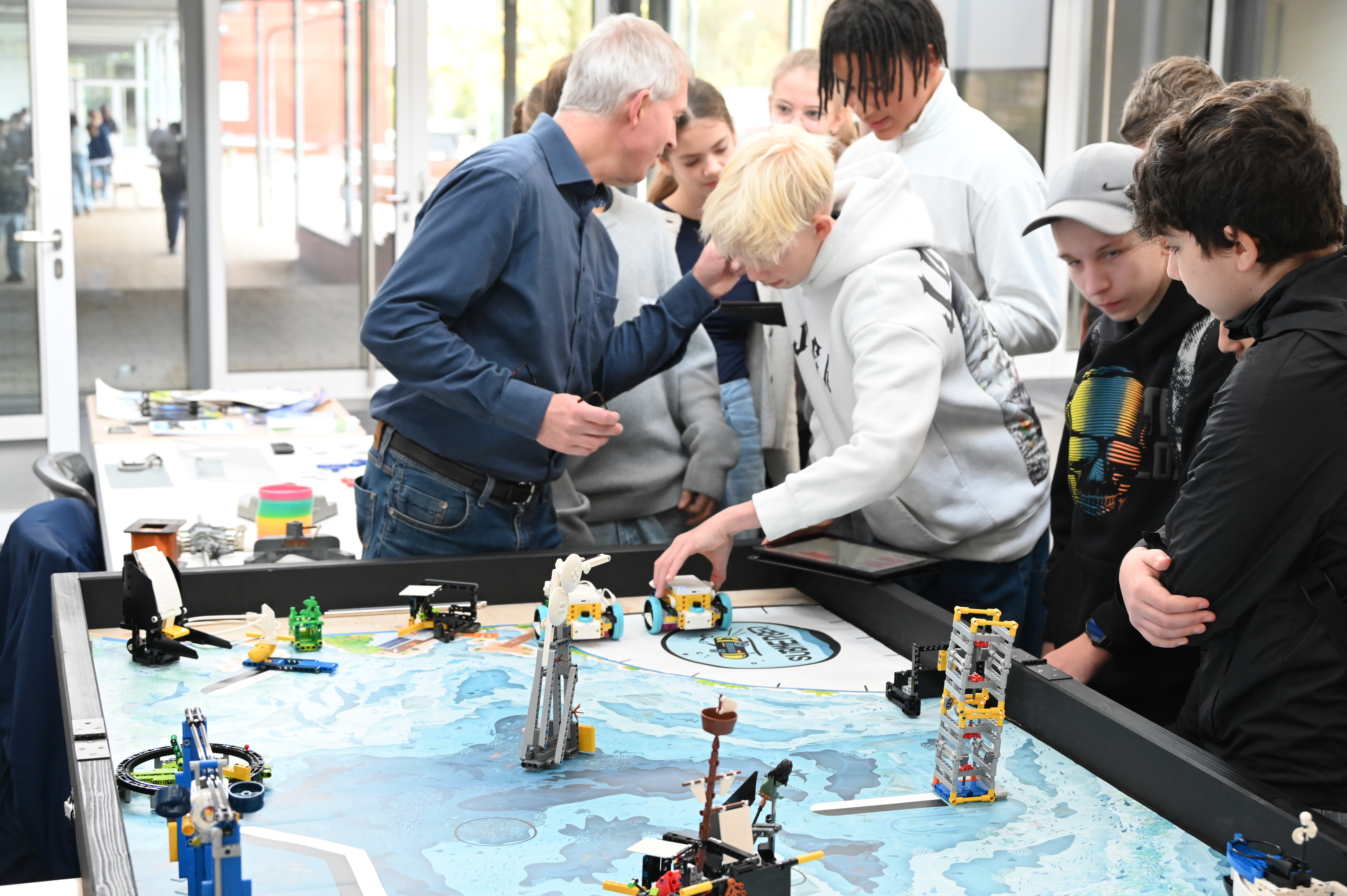 Die zahlreichen Mitmachangebote luden zum Ausprobieren ein. Im Atrium konnte man am Stand des Mathematik-Zentrums Wetzlar an mathematischen Rätseln knobeln, mit den Robotern des Gymnasiums Johanneum Herborn sprechen, an der Universität Siegen einen eigenen Elektromotor bauen, seine Geschicklichkeit bei Cohline am „Heißen Draht“ prüfen und am Stand der Isabellenhütte sein Wissen über Metalle unter Beweis stellen. Auch in der Eingangshalle gab es viel zu entdecken. Am Stand des Schülerforschungszentrums Mittelhessen wurden Lego-Roboter programmiert, der Verein Deutscher Ingenieure (VDI) informierte über 3D-Druck, bei Wendel-Email durfte emailliert und am schuleigenen Stand mikroskopiert werden. Elektrotechnik zum Anfassen boten zudem die EAM, Loh-Services und Carl Cloos Schweißtechnik. Ein besonderer Anziehungspunkt war der große Stand der Technischen Hochschule Mittelhessen, an dem die Schülerinnen und Schüler ihren eigenen Game-Controller bauen und programmieren konnten.