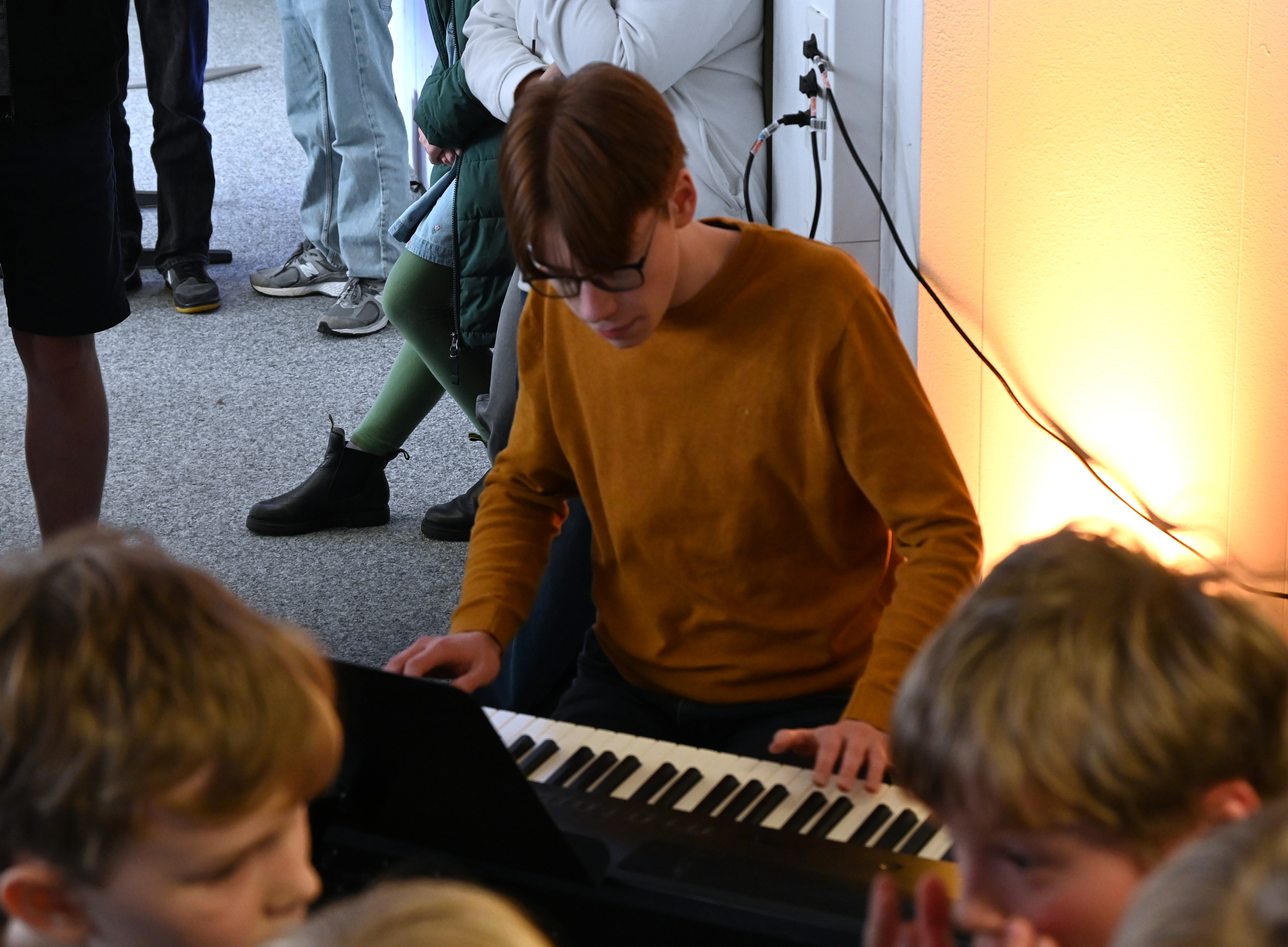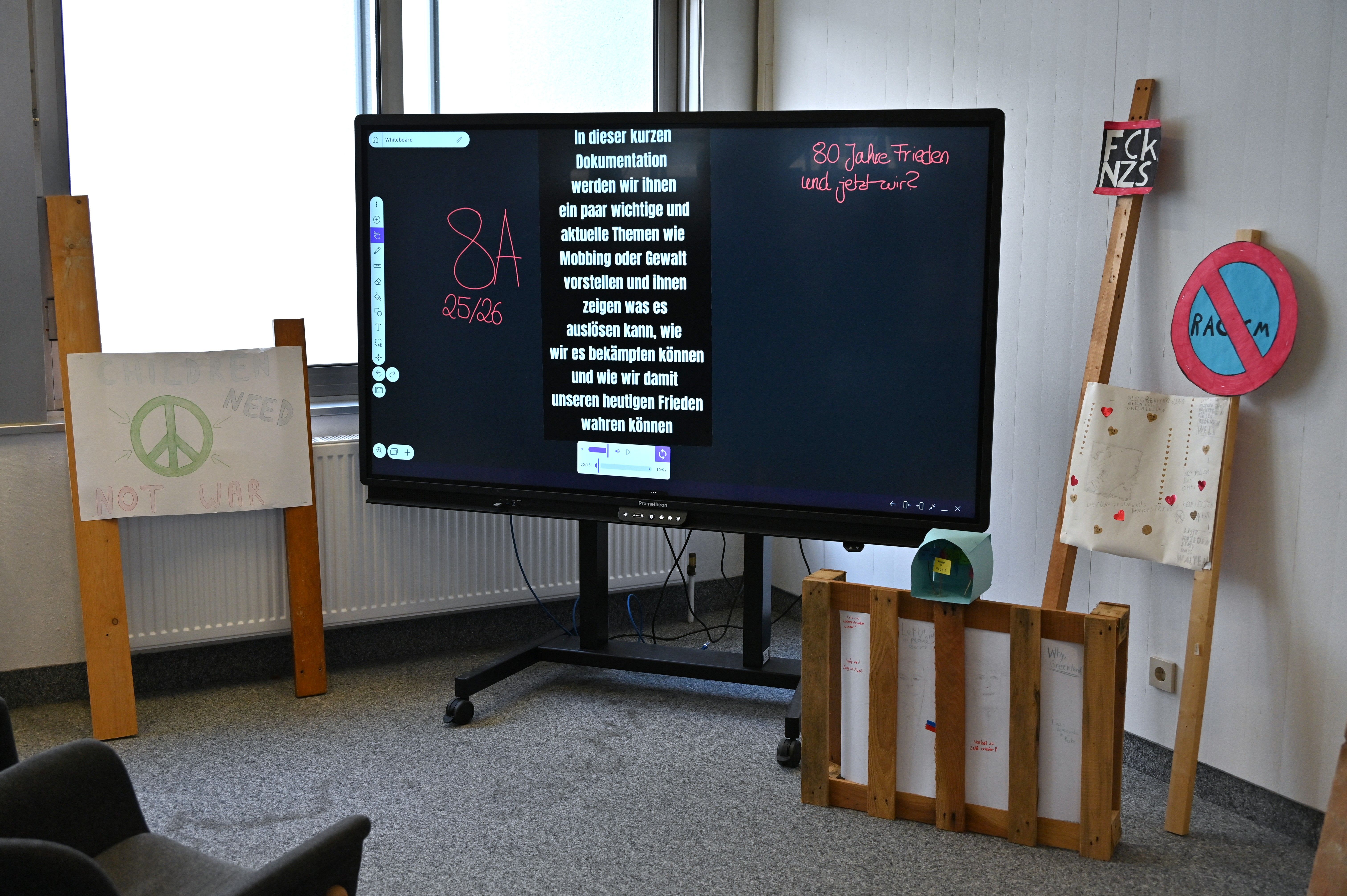 Die aus verschiedenen Klassen oder von Einzelpersonen eingegangenen Wettbewerbsbeiträge wurden nun in einer Ausstellung zusammengetragen und in einer festlichen Vernissage am 2. Februar der Öffentlichkeit präsentiert. Die AG-Mitglieder Kati Weigel und Jonas Seibel begrüßten in ihrer Eröffnungsrede die zahlreichen Gäste: alle Wettbewerbsteilnehmerinnen und -teilnehmer, viele interessierte Schülerinnen und Schüler sowie Lehrerinnen und Lehrer, aber auch Vertreterinnen und Vertreter des Schulelternbeirates. Schulleiter Martin Hinterlang zeigte sich in seinem Grußwort beeindruckt von der Vielfalt an Produkten, die zusammengetragen wurden: Texte in Form von Erlebnisberichten oder Gedichten, Videoclips mit Spielszenen oder Zeitzeugeninterviews, selbstgeschriebene Lieder oder künstlerische Installationen, die das Thema bildlich ergründen, und vieles mehr. Musikalisch umrahmt wurde die Vernissage von Jonatan Schmidt am Piano, der mit John Lennons „Imagine“ dazu anregte, sich eine friedlichere Welt als die jetzige vorzustellen.