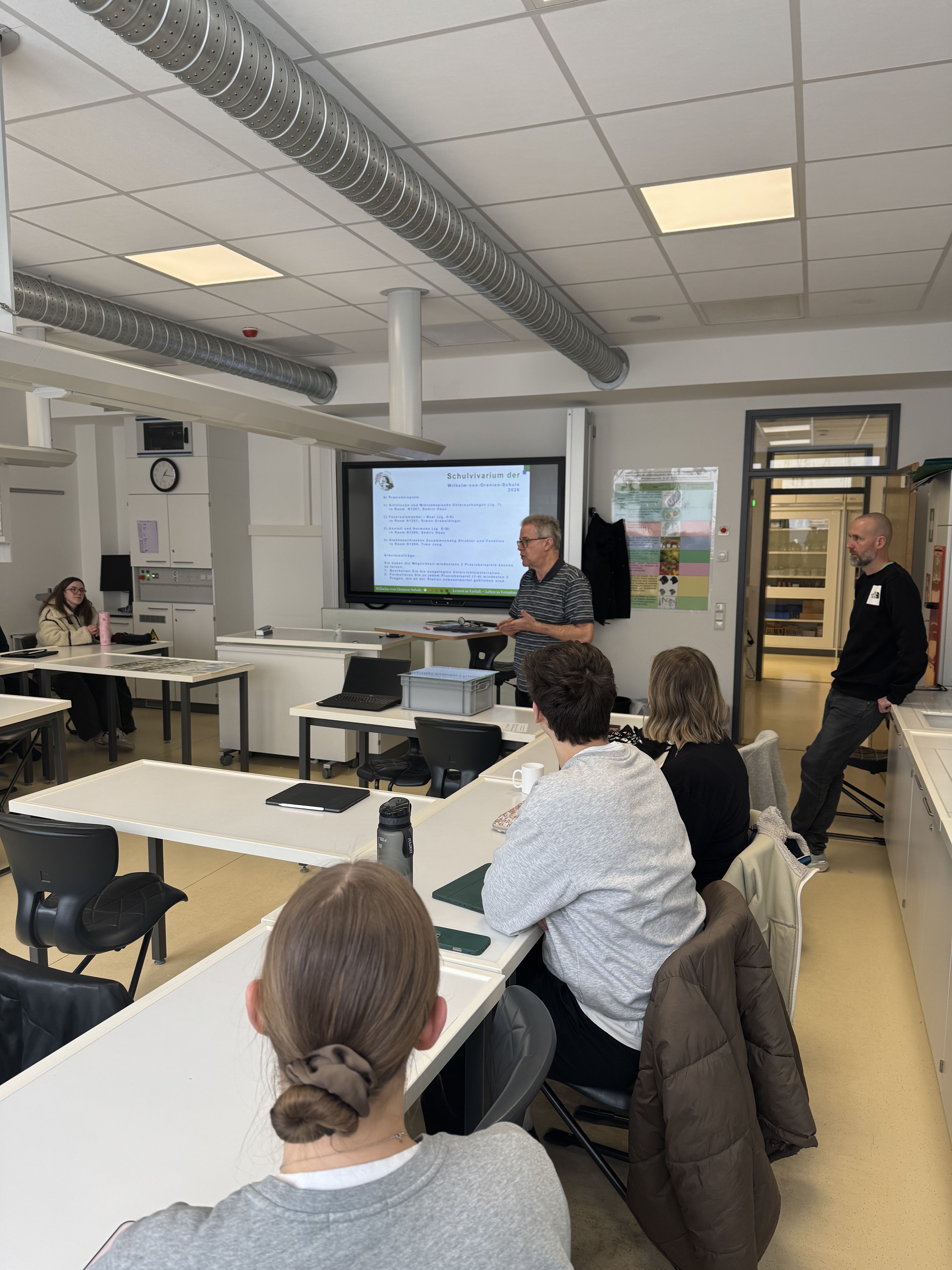 Am 02.02.2026 nutzten 21 Studierende der Biologiedidaktik der Justus-Liebig-Universität Gießen den frühen Unterrichtsschluss im Zuge der Ausgabe der Halbjahreszeugnisse, um sich intensiv und ungestört mit der Arbeit im Schulvivarium der WvO auseinanderzusetzen.