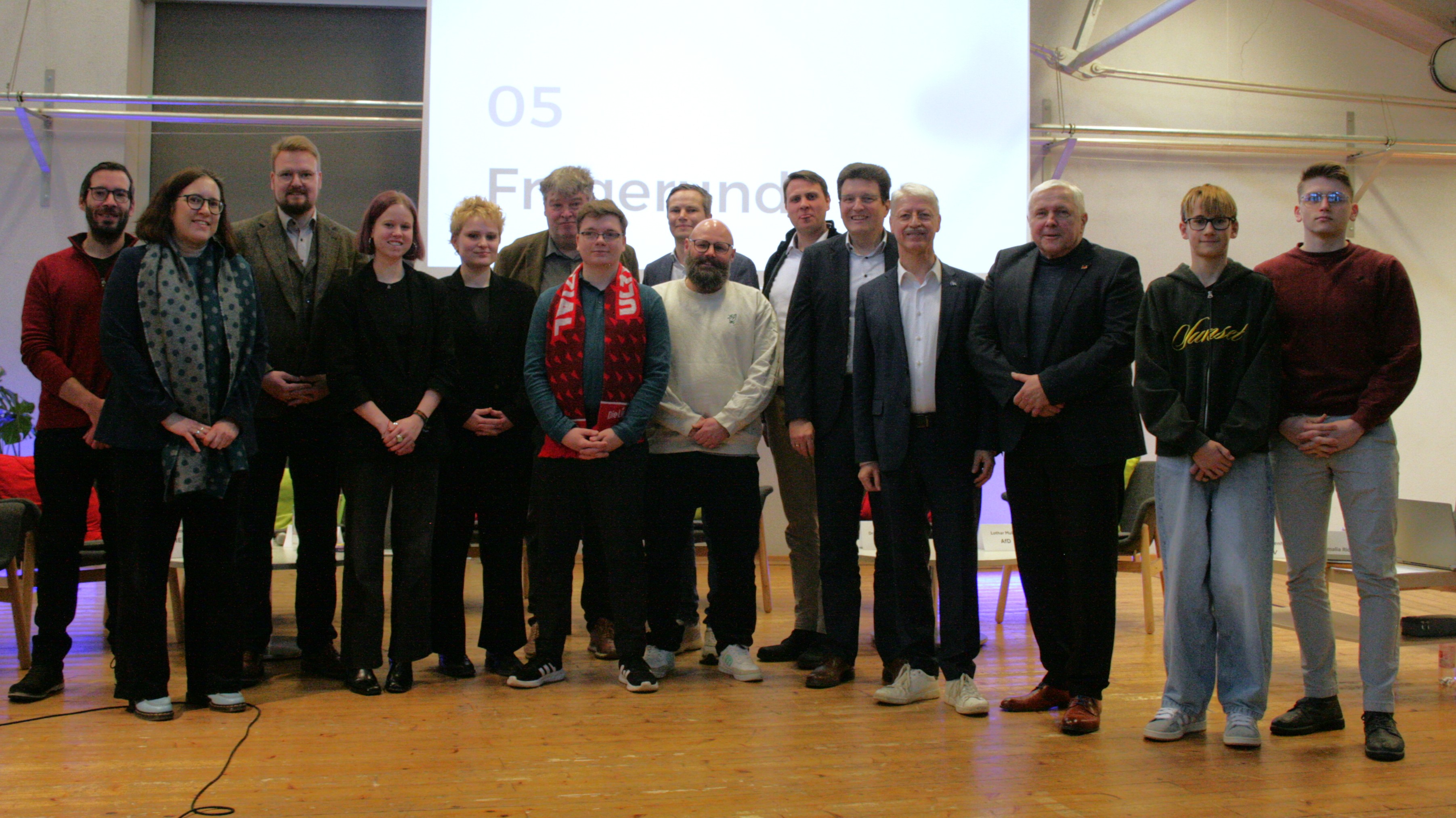 Gäste und Gastgeber der Podiumsdiskussion, von rechts: SV-Mitglieder Lyubomyr Vashchyshyn, Willi Schneider, Lothar Mulch (AfD), Dr. Matthias Büger (FDP), Dr. Andreas Viertelhausen (FWG), Leo Müller, (CDU), Sebastian Brockhoff (B90/Die Grünen), Moritz Böcher (SPD), Tim Sinkel (Die Linke), die Moderatoren Dr. Siebo M.H. Janssen, Ella Bodenhöfer und Amalia Richter, Lehrkräfte Jonas Seibel, Kerstin Renkhoff und Sebastian Sebö
