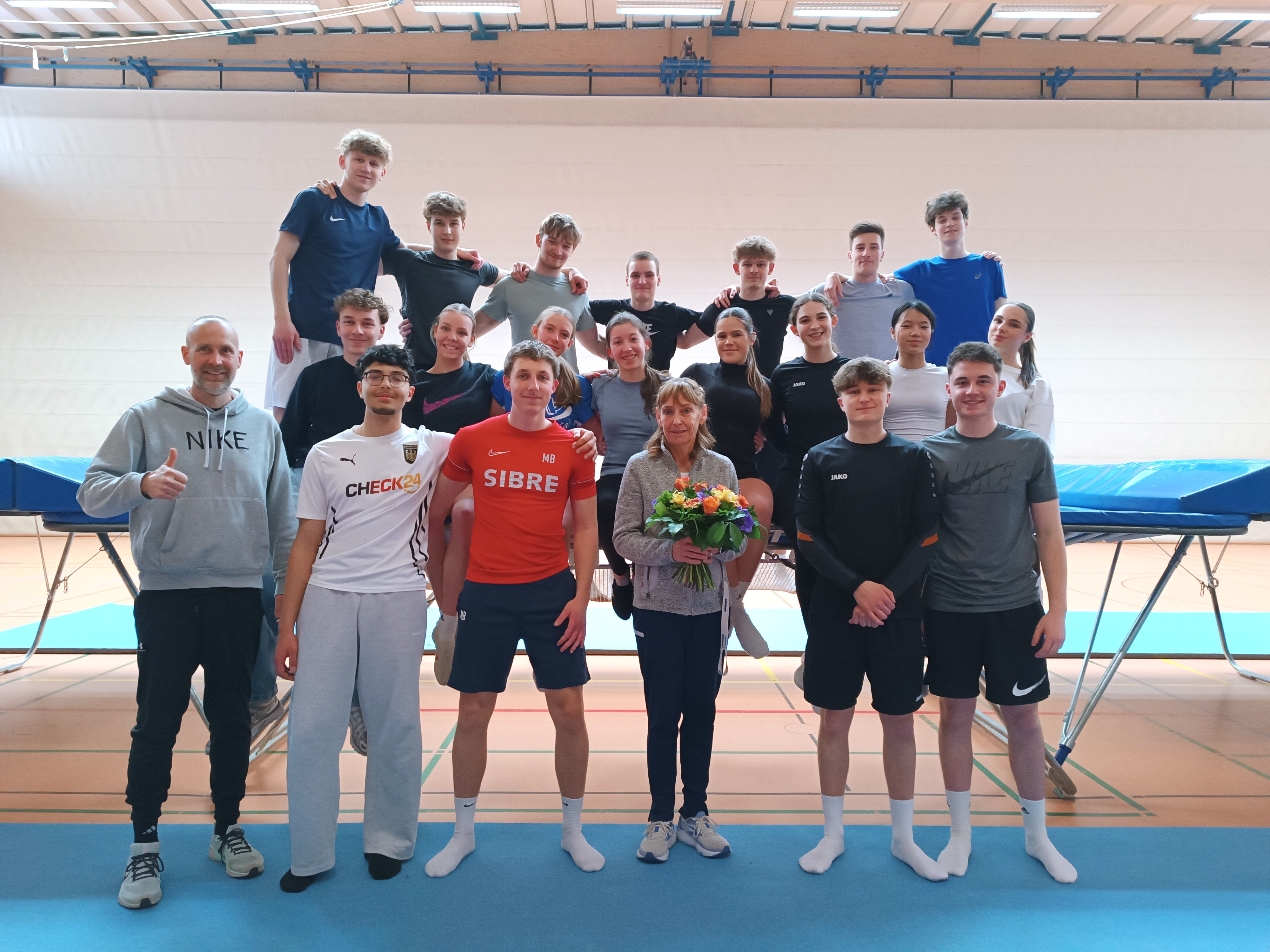 Ein intensives Anleiten von Sabine Kölzer, Trainerin des hessischen Leistungszentrums Trampolin, und ein diszipliniertes Mitarbeiten machten es möglich, dass der Q2-Sport-Leistungskurs von Sedric Haus einen Lehrgang „Trampolinturnen“ zur regulären Unterrichtszeit absolvieren konnte. Innerhalb von fünf Wochen erarbeiteten sich die 21 Teilnehmerinnen und Teilnehmer die festgelegte Trampolinprüfungskür „P3“, „Salto vorwärts“, „Salto rückwärts“ und die „360° Schraube“. Neben den turnerischen Elementen erlernten die Sport-LKler wichtige organisatorische Abläufe des sicheren Auf- und Abbaus der Trampoline sowie das gegenseitige Sichern der springenden Mitschülerinnen und Mitschüler. Jede Übungseinheit an den Trampolinen wurde durch ein effektives Kraft- und Beweglichkeitstraining durch die aktiven Turnerinnen und Turner des Kurses – Nele Berghüser, Thea Schicker und Till Wagner – angeleitet und trieb bereits zu Stundenbeginn so manche Schweißperle auf die Stirn der Teilnehmenden.