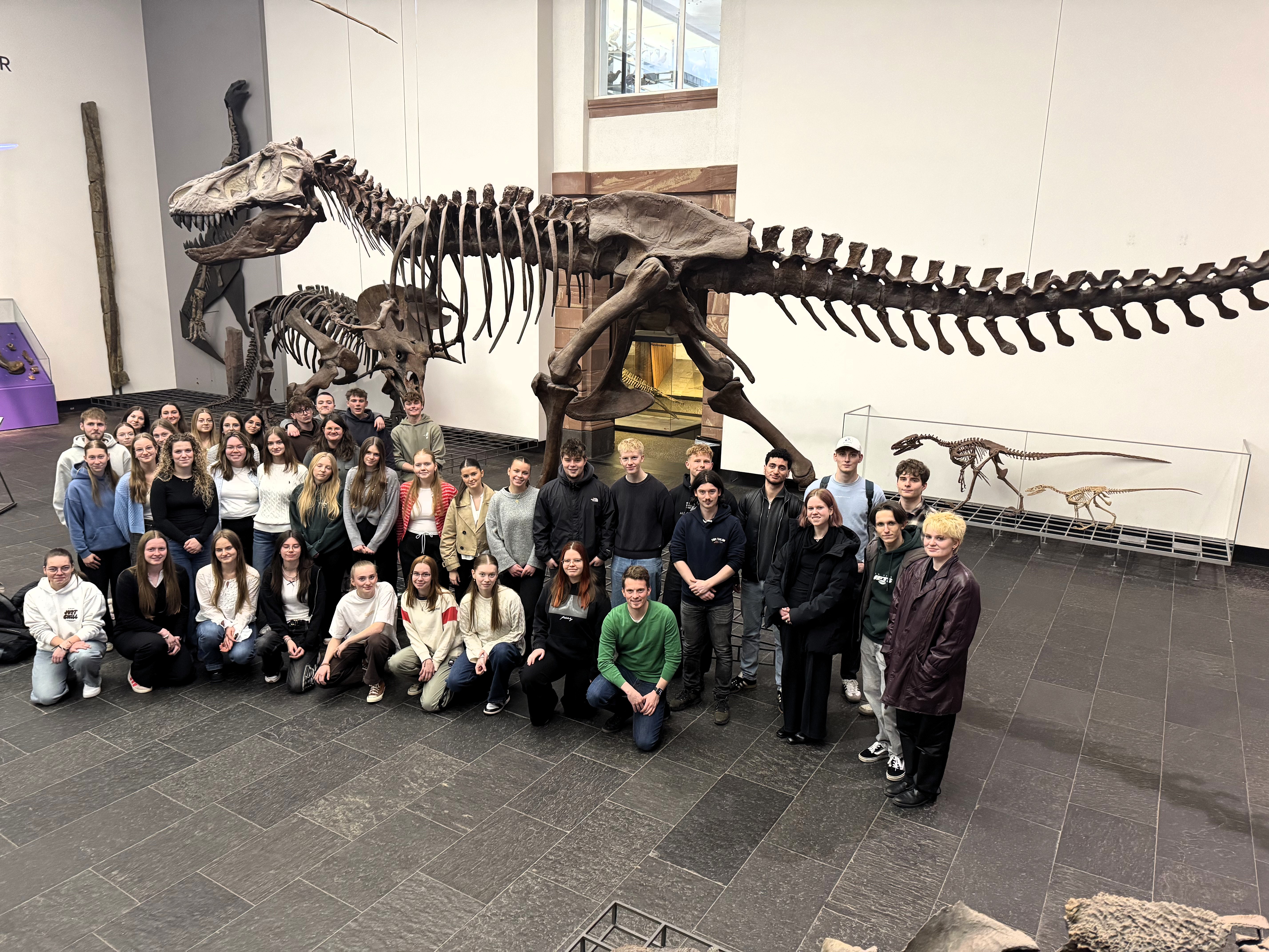 Generell bot das Museum vielfältige Möglichkeiten, die im Unterricht behandelten Inhalte zu vertiefen, zu vernetzen und durch originale Exponate greifbar zu machen. Ein besonderes Highlight für alle Beteiligten war natürlich die beeindruckende Dinosaurierhalle. Vor der imposanten Kulisse der Saurierskelette nutzten die Kurse die Gelegenheit für gemeinsame Erinnerungsfotos zum Ende ihrer Schulzeit.